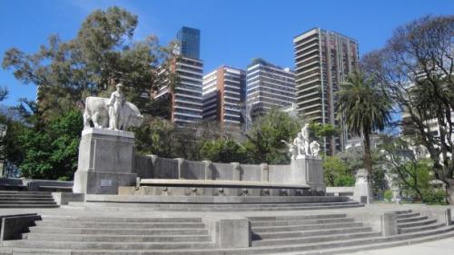 En ese mismo sector se encuentra una fuente, de trazado similar al mencionado murete que remata en sus extremos en dos bases cuadrangulares donde se encuentran emplazados los dos grupos escultóricos que representan a la agricultura y la ganadería.