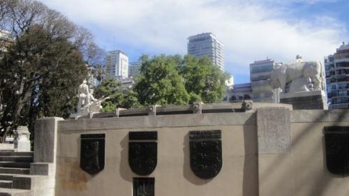 En la parte posterior de este monumento se extiende un banco circular dividido en su parte media en dos sectores, donde se encuentra una escalinata. Los extremos frontales están coronados por dos motivos decorativos que gobiernan una amplia superficie circular.